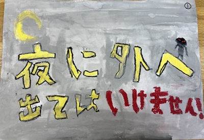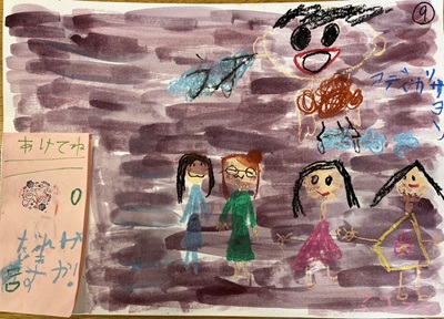 さあ、時は来たり。タイトルは「夜に外に出てはいけません」・・・大人は言います。「子どもだけで夜、外に出てはいけないよ!」と。どうして?なぜダメなの?それはね・・・雪女やゾンビ、貞子にアメリカから来た鬼、口が二つある狼などなどいろんな怖いものがいるからだよ。だから夜はお家の中で遊ぼうね。というお話。ストーリーも出てくるキャラクターも全部子どもたちが考えました。ストーリーは、大人の発想だと冒険モノやハートウォーミングモノを考えがちですが、子どもは怖いものが大好き。怖いけれど好き。だからキャラクターも次々出てきました。子どもたちが作った子どもたちの紙芝居、みなさん楽しんでくれていた様です。中にはハッピーなものを想像していた方もいらっしゃると思いますがこれが子どもたちのリアルです。怖いものすら楽しんでしまう逞しい子どもたち。全9場面の紙芝居、めでたく完結いたしました!みなさんから拍手をいただき、上手だったねと褒めて頂き、満足顔の子どもたち。よかったよかった!(一番ホッとしたのは私かもしれませんが汗)帰り際、「また作りた〜い」の言葉に「そうだね、またやろうね!」とすぐに言えなかった私でした汗×2