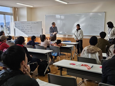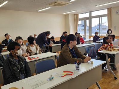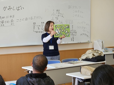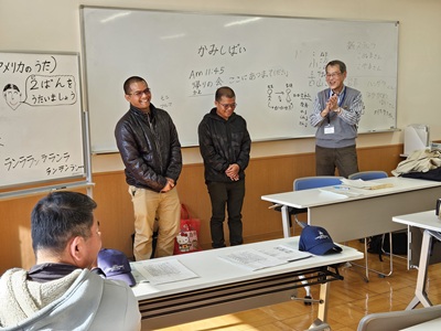 11月16日に開催された第38回とちぎ蔵の街校では、小学生クラス4名、中高生クラス5名、社会人クラス12名の計21名の学習者が参加しました。スタッフは3クラス合わせて12名でした。そして、この日は新たな学習者5名とスタッフ2名が参加しました。前回と同様、社会人と中高生クラスのスタッフ数が足りなかったため、初参加のお二人に早速担当を依頼し、小学生クラスと国際交流協会の方々からも応援をえた結果、今回も活気あふれる楽しい学習交流活動になりました。スタッフどうしの協力は実にありがたいです。朝のミーティングでは、TTコンビの一人(戸井田さん)が参加したため、先週音頭をとったYさんと私はほっと胸を撫で下ろしました!! Tさんの鍵盤ハーモニカの伴奏で、今月の歌「線路は続くよ どこまでも」の1番を、今回は学習者もスタッフも座ったままで歌いました。そのあと初参加の学習者3名とスタッフ2名の紹介とあいさつもありました。