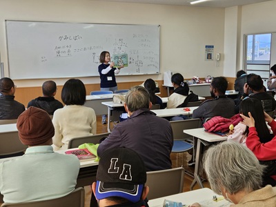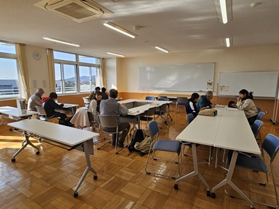 今日は支援者が少なかったので社会人の学習者に対応できるか不安になってきた。全体のミーティングはSさんが仕切ってくれた。ミーティングの後、恒例となっている合唱を始めた。今回はTさんの鍵盤ハーモニカで「線路はつづくよどこまでも」の2番を合唱した。「せんろはうたうよいつまでもれっしゃのひびきをおいかけてリズムにあわせてぼくたちも……」Tさんの踊りながらの演奏に彼女の真剣さがビシビシ伝わってきた。いつものようにKさんの隣の席に座り合唱した。Kさんは前のボードに書いてある文字を追いかけながらゆっくり口を動かしていた。ふと、Kさんの足元を見るとサンダルに靴下を履いていた。それにしてもサンダル履きとはいくら靴下を履いていても寒くはないのかと気がかりだった。今日はTさんが来たのでKさんを支援することになった。Tさんは長年Kさんを支援している。来年の7月にN5に挑戦すると新たな目標を立てている。Kさんの本気度が目チカラに現れているような気がする。彼と向き合うといつでも真剣な丸い目を向けてくるからだ。Kさんの友達のNさんが今日は遅れないで来てくれた。朝寝坊しなかったのかKさんに声掛けられて来たのか分からないが、このところ毎回来てくれる。彼はフォクリフトリトの免許を取るために休んでいたことがあったので、免許を取ることができたのか尋ねたら「ハイ、取れました」と緩く答えてくれた。やはり努力をしていたのだと彼の肩をポンと叩くと笑みを浮かべてくれた。Nさんの支援はIさんがしていたが休みなので誰に支援してもらうか見渡したら、初めて参加してくれた大学院生のKさんと眼があったのでお願いしたら、快く引き受けてくれたので安堵した。彼は丁寧に支援してくれていた。