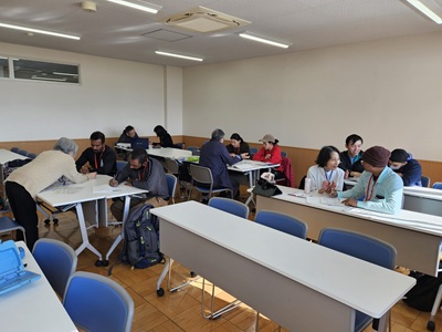 中高生クラスの5名は、中学1年Kさん(フィリピン)、中学2年Bさん(ネパール)、中学3年で初参加のHさん(パキスタン)、母国の中学で4年を修了して初参加のSさん(ネパール)、高校2年Nさん(日本)でした。中学1年のKさんはスタッフTさんが応援しました。Tさんのコメントは、「形の似た漢字の読み方や、書き方を熱心に学んだ。くり返しの学習が重要である。英語は特に問題もなく、学習できた。数学の作図(正六角形)に関心を持っていたが、まだ作図の基本を理解していない。」というものでした。漢字についてはくり返しの学習、数学については作図の基本を理解することが当面の課題である点を引き継ぎとして確認できました。