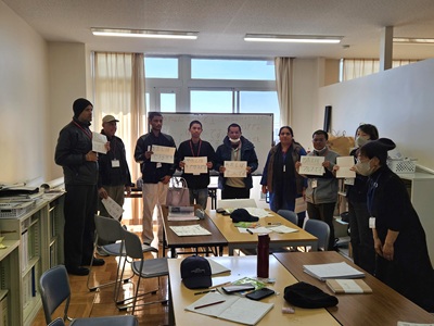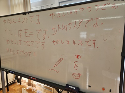 〇「私は○○です」皆さんの前で、一人ずつ自分で書いた名前の用紙を掲げて自己紹介を行いました。学習者全員が、自信に満ちた様子で、恥ずかしがらずに堂々とできました。わずかな学習内容でしたが、今回のレッスンの成果となりました。