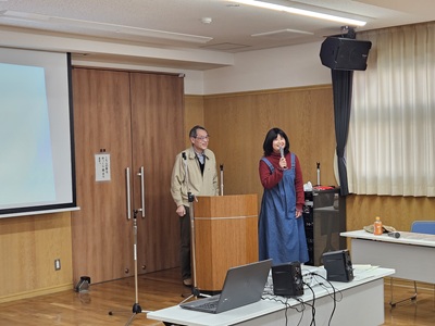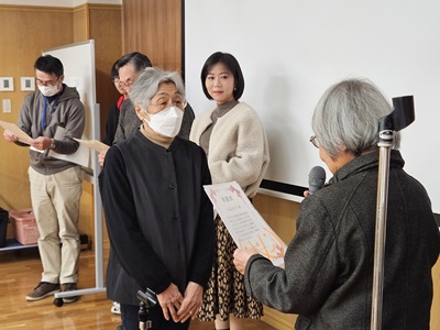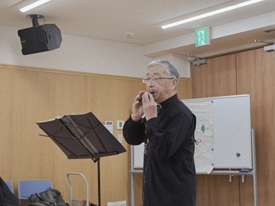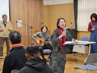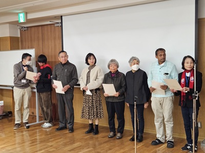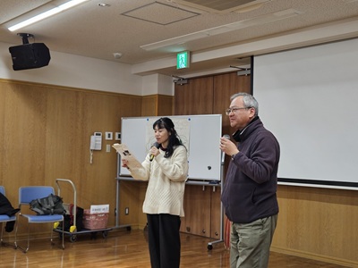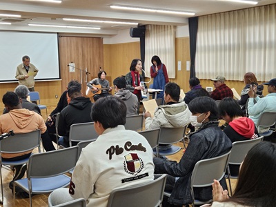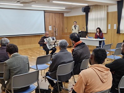 最後は皆で歌う歌のコーナー。最初はアコーディオンの演奏で「青い山脈」。「若く明るい歌声で 雪崩も消える 花も咲く」。そうか、若く明るい歌声は雪崩も消してしまうのか!!と歌詞に共感。外国人学習者でこの歌を知っている人は多分一人もいなかったでしょうが、歌いたくなり、このコーナーに入れました。最後の2曲は2024年12月の歌である「おお 牧場はみどり」と蔵の街校の仮の校歌「前を向いて歩こう」を皆で一緒に。「仮り」と言い続けて気が付けば4年が過ぎましたが、今後はどうなっていくでしょうか?最後の挨拶を経て、閉会となりました。