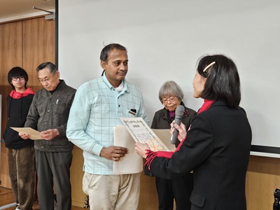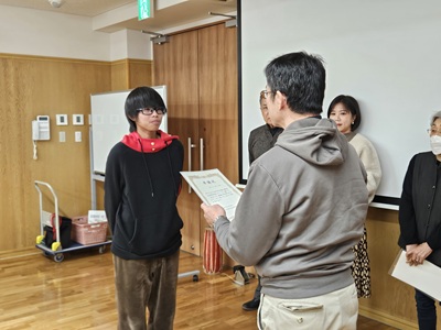 次は表彰式。たくさん参加してくれた学習者に皆勤賞や感謝状と記念品を贈りました。記念品は「宇都宮大学」の名前が入っているシャープペンシルとボールペンです。表彰は普段応援しているスタッフが行いました。皆勤賞と感謝状の文面は1つ1つ作成しました。表彰された学習者の1人はとても遠慮深い人で、事前に表彰のことを伝えたら交流会には絶対に来ないと予想できたので、何も知らせていませんでした。感謝状を渡された後の挨拶で、「表彰されると言われたら来なかった・・」と言っていました。作戦成功でした。