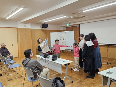 次は、小学生と中高生クラスからの振り返りや学習の成果の発表。小学生のクラスは紙芝居を作成し、振り返りのミーティング等で発表してくれましたが、その楽しい思い出がよみがえりました。中高生クラスの発表では、蔵の街校に関するクイズが用意されていました。参加者全員が○×形式で応え、正しく答えた人が生き残っていくサバイバル形式のクイズです。確か3人が最後まで生き残ったと思います。ちなみに、自分は最初の質問で脱落しました・・ほとんど毎回参加してきたのに・・・