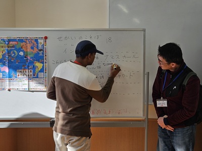 学習者4名、新年の誓(ちか)いを漢字1字で書くという課題(かだい)で、Kくんは「友」という漢字を選びました。Bさんはひらがなとカタカナの練習をし、スタッフSさんが「ふ」の書き方を英語で説明(せつめい)。Aくんは、高校入試の作文と面接をスタッフYさんと練習しました。高校2年に入学希望のSくんは、小学生漢字帳を使って自分で漢字の読み・書きを学習しました。KくんとSくんは私が担当(たんとう)。(S)<社会人(しゃかいじん)クラス>