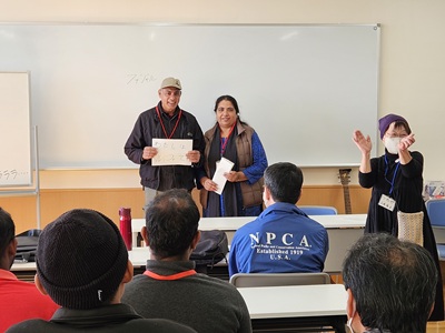 〇「私は○○です」皆さんの前で、一人ずつ自分で書いた名前の用紙を掲げて自己紹介を行いました。学習者全員が、自信に満ちた様子で、恥ずかしがらずに堂々とできました。わずかな学習内容でしたが、今回のレッスンの成果となりました。