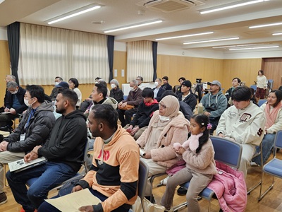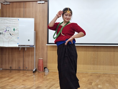 パキスタンのご夫妻がパキスタンの歌を披露してくれました。21日の学習の時に、たまたま自分が応援することとなり、いろいろなトピックで話をしていたのですが、どういう流れだったか祖国の歌の話になり、その日の振り返りのミーティングの時に披露してくれたのです。交流会でもお願い!と頼んだところ、即答でOKをもらいました。ご夫妻の歌の後には、10代の若者2人が参加してくれました。ネパール民謡「レッサン フィーリィーリィー」(絹のサリーがひらひら)。2024年8月末に開催した『中学教科単語帳』(日本語⇒ネパール語)発行記念交流会を大いに盛り上げてくれた民謡です。発行記念交流会では踊る人が続出しました・・とてもノリが良いリズムで思わず身体を揺らしたくなります。