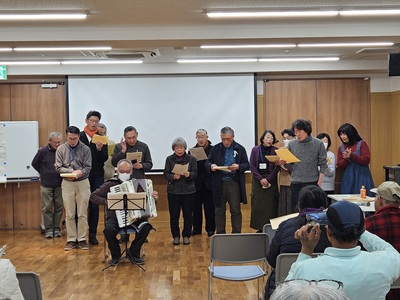 最後は皆で歌う歌のコーナー。最初はアコーディオンの演奏で「青い山脈」。「若く明るい歌声で 雪崩も消える 花も咲く」。そうか、若く明るい歌声は雪崩も消してしまうのか!!と歌詞に共感。外国人学習者でこの歌を知っている人は多分一人もいなかったでしょうが、歌いたくなり、このコーナーに入れました。最後の2曲は2024年12月の歌である「おお 牧場はみどり」と蔵の街校の仮の校歌「前を向いて歩こう」を皆で一緒に。「仮り」と言い続けて気が付けば4年が過ぎましたが、今後はどうなっていくでしょうか?最後の挨拶を経て、閉会となりました。